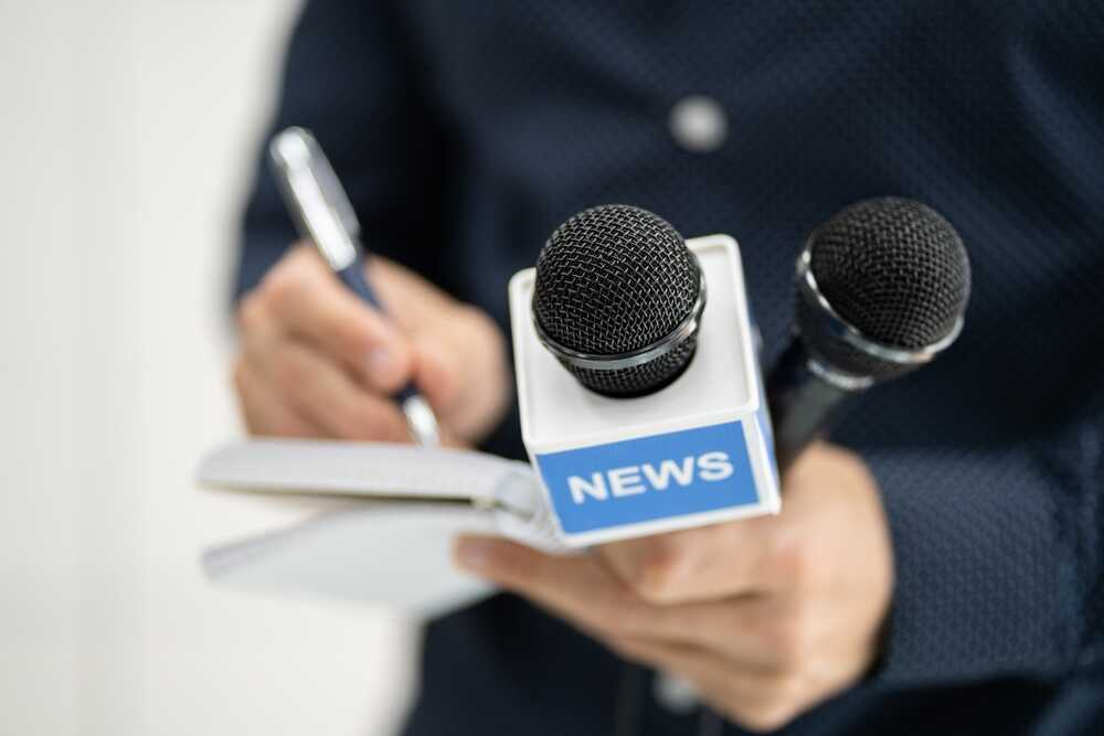 A journalist holding a notebook and microphones labeled 'NEWS'